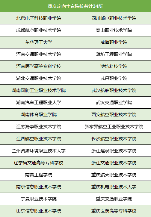 2024年在重庆招定向士官的院校共有34所,包括重庆航天职业技术学院、重庆医药高等专科学校、成都航空职业技术学院等。