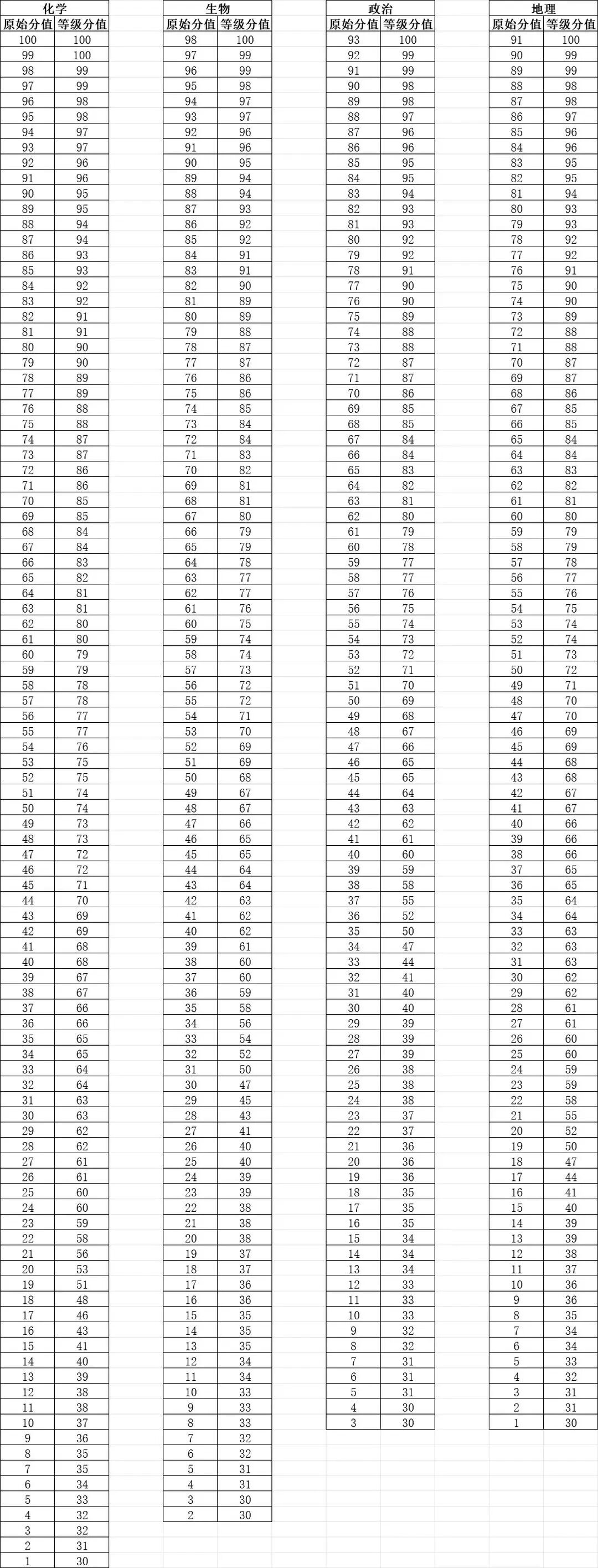 化学90可赋分到95;生物98可赋分到100;政治93可赋分到100;地理91可赋分到100。