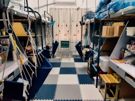 四人间寝室配置有单人铁床、单人多用柜、小方凳、电视机等,有预留的电脑网络接口和电话机接口。铁床上附有箱架,有独立的卫生间或单元内卫生间。卫生间内有淋浴、盥洗等设施。