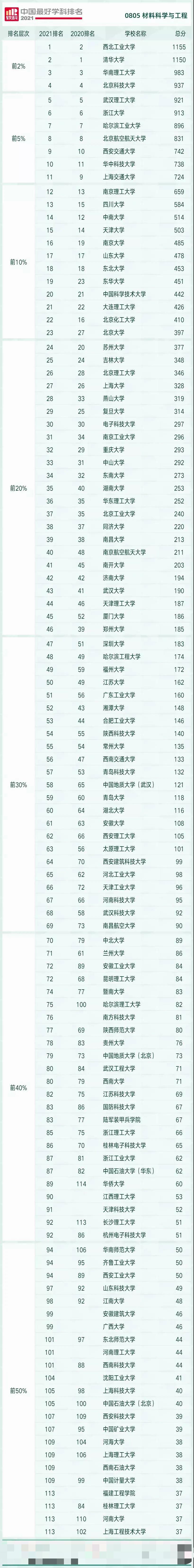 来看看软科2021材料科学与工程专业的院校排名吧: