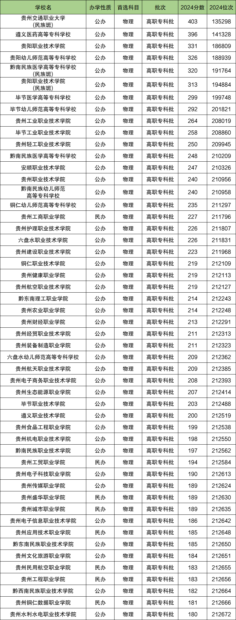 下文为2024年贵州省专科大学在贵州物理类录取分数线和位次排名表,供大家参考: