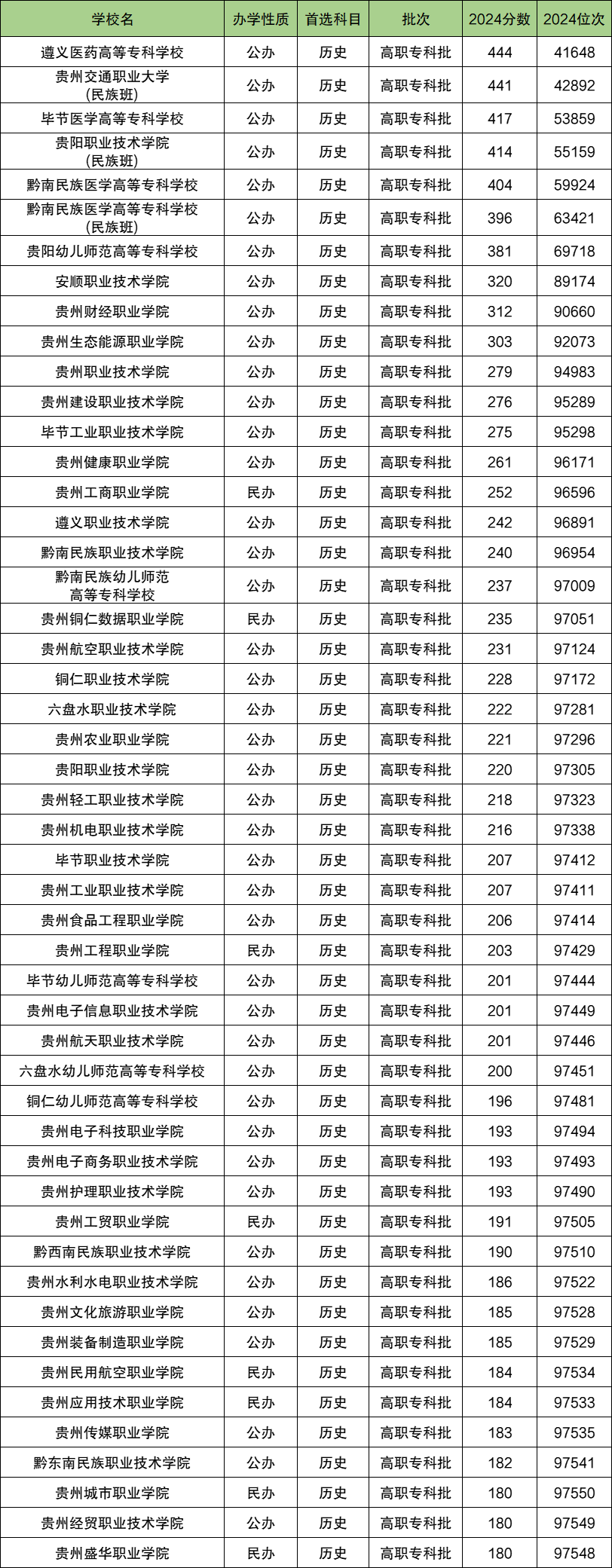 下文为2024年贵州省专科大学在贵州历史类录取分数线和位次排名表,供大家参考: