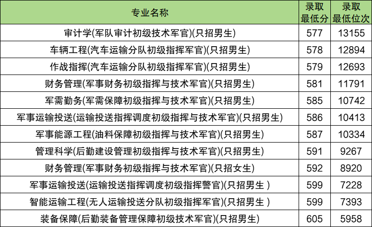 最低分专业为审计学(军队审计初级技术军官),最低分数线577分,最低位次是13155名;