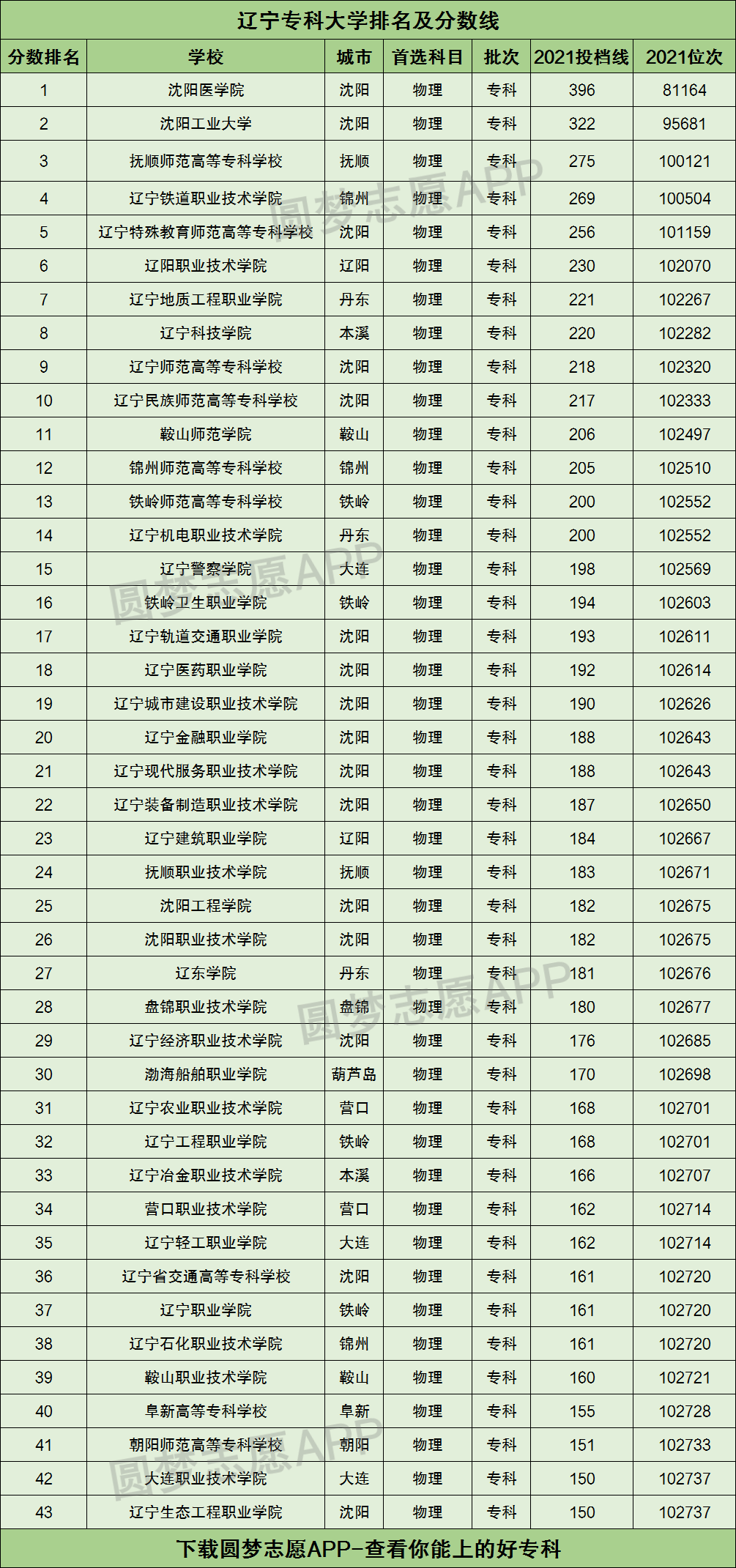 小编根据圆梦志愿APP提供的数据,为大家整理出了所有位于辽宁省内、且在辽宁省专科批次中招生的公办大学名单,并且将其按照2021年物理类投档分数线的高低进行了排序。下图便是辽宁省专科大学的最低分数线排名: