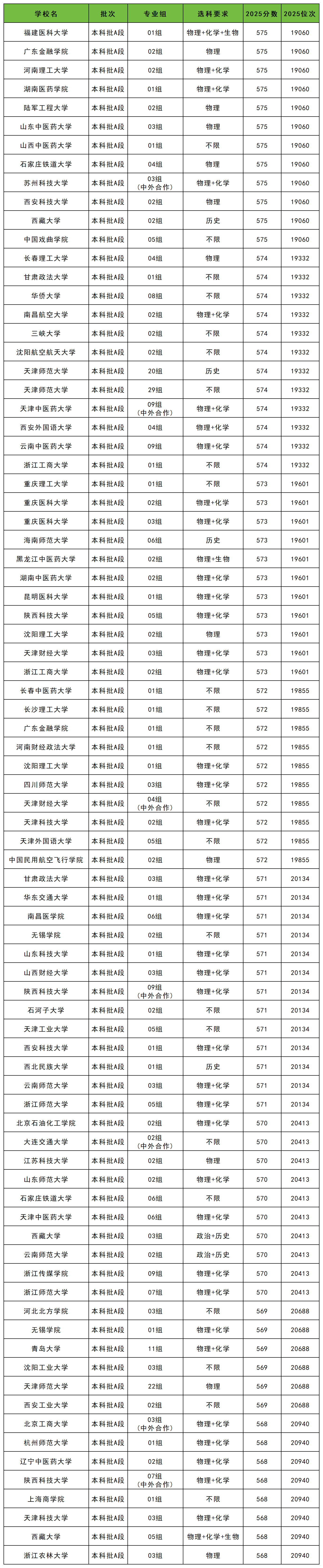 2万名左右最高位次对应的院校专业组有福建医科大学(01组)、广东金融学院(02组)、河南理工大学(02组)等,最低录取位次为19060位,位次对应分数为575分;