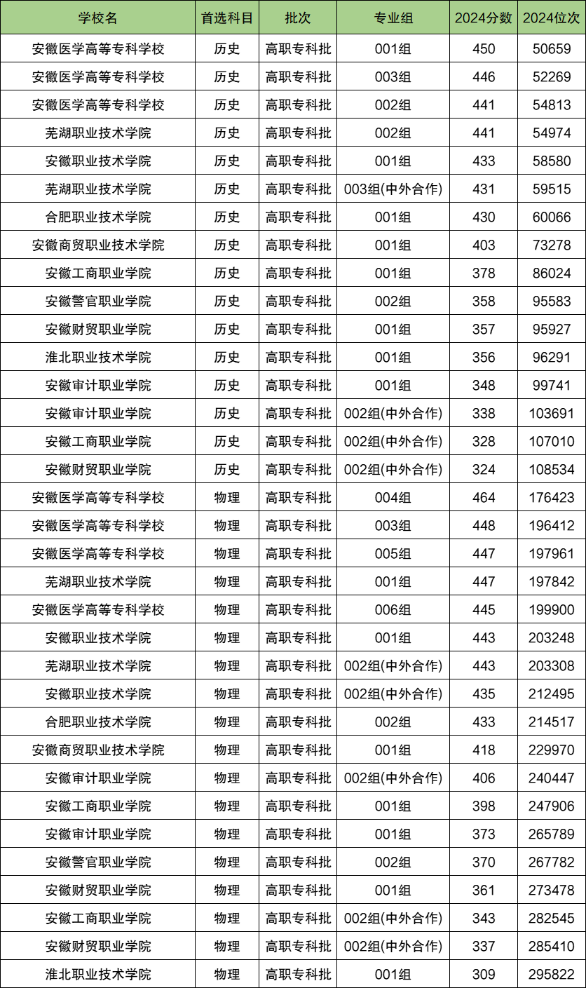 根据安徽省2024年高考录取分数线,本文整理出了安徽省前十名专科大学在历史类和物理类的最低录取分数线,以供考生和家长参考。