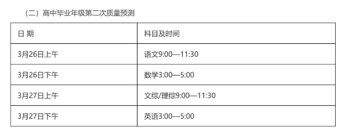 本次考试持续时间为2天,具体时间为3月26日-27日,科目包含5科,其中语文和综合科目的考试时长一样,均为150分钟,数学和英语的考试时长一样,均为120分钟。考生要合理安排考试时间,以免出现试卷做不完的情况。