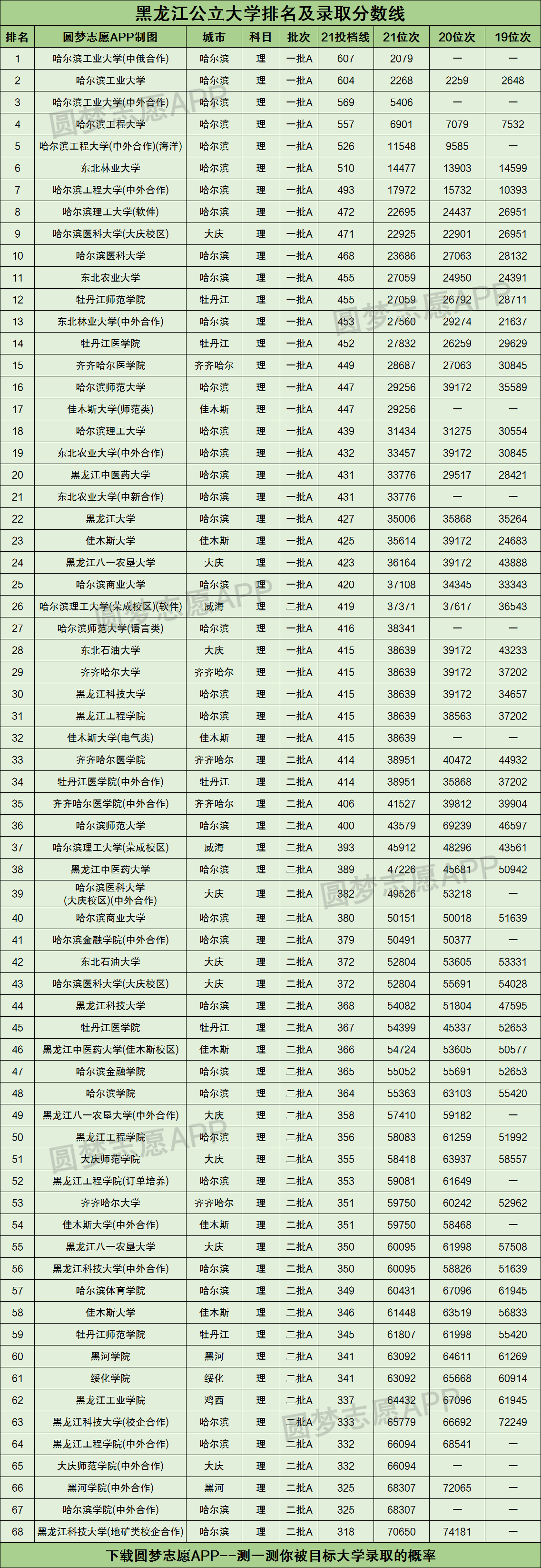 下图为黑龙江省所有公立本科大学的2021年理科投档分数线排名(篇幅有限,仅展示了黑龙江理科的录取数据。文科生可以直接下载圆梦志愿APP查看数据)