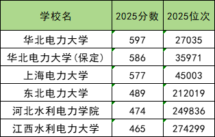 从下表来看,在已公布录取分的电力大学中,分数最高的学校是华北电力大学,分数线为597分。 分数线最低的学校是江西水利电力大学,分数线为465分。