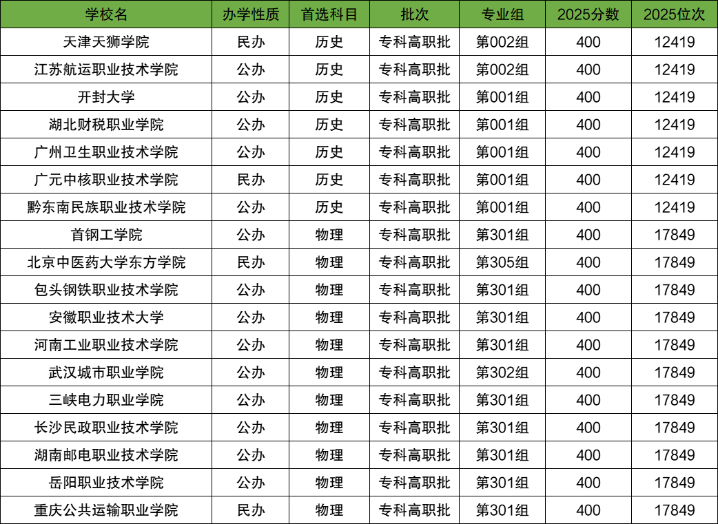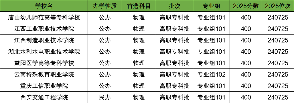 2025年四川省高考400分,物理类能上的大学有唐山幼儿师范高等专科学校、江西工业职业技术学院、江西制造职业技术学院、湖北水利水电职业技术学院等;历史类没有在400分录取的学校。