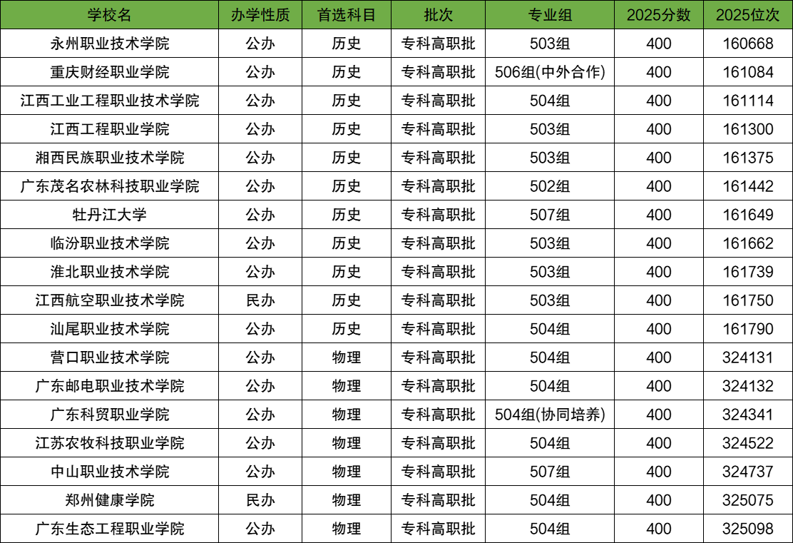 2025年广东省本科线历史类为464分、物理类为436分,因此广东省400分上不了本科大学,只能上专科院校。历史类有永州职业技术学院、重庆财经职业学院、江西工业工程职业技术学院等;物理类有营口职业技术学院、广东邮电职业技术学院、广东科贸职业学院等。