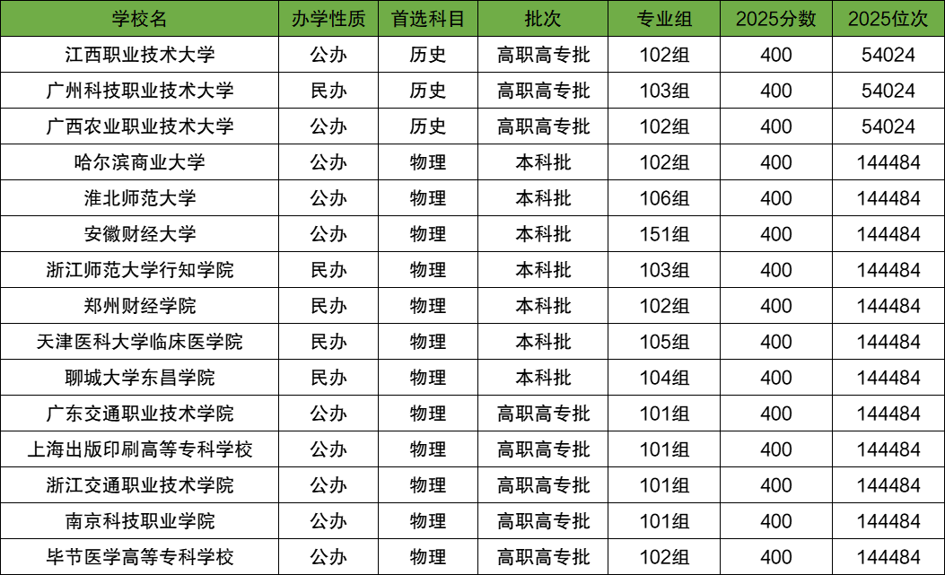 400分能上的物理类大学有哈尔滨商业大学、淮北师范大学、安徽财经大学等,历史类能上的专科院校有江西职业技术大学、广州科技职业技术大学、广西农业职业技术大学。