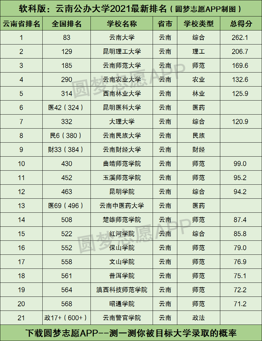 根据软科2021年中国大学排名榜单,小编为大家整理出了云南省内上榜的全部公办大学名单:包含这些大学在全国的排名、以及在云南省内的排名。