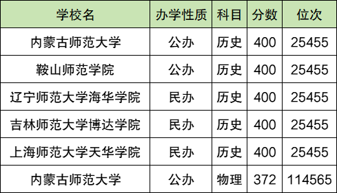 2024年辽宁历史组师范大学最低分400分,对应分数线最低的学校有内蒙古师范大学、鞍山师范学院、辽宁师范大学海华学院、吉林师范大学博达学院。