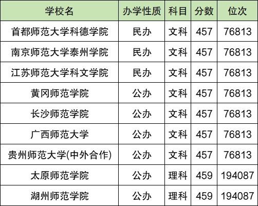 2024年四川文科师范大学最低分457分,对应的学校有首都师范大学科德学院、南京师范大学泰州学院、江苏师范大学科文学院、黄冈师范学院等。