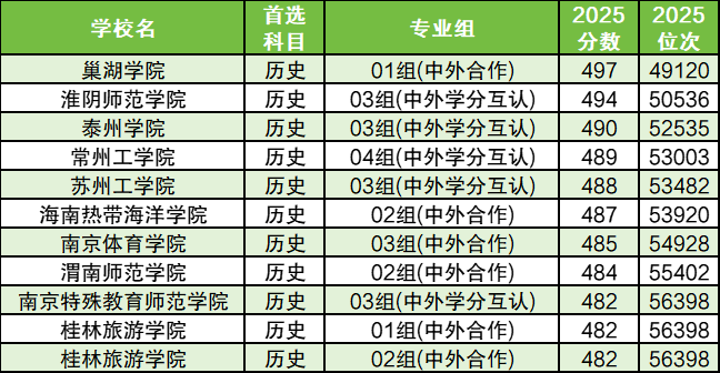 这些专业组均为中外合作办学专业,收分虽低,但专业学费较高,考生报考时需注意。下面2025历史类分数较低的一些公办二本院校: