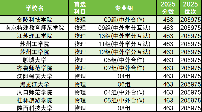 依旧以江苏省2025年高考物理类招录数据为例,理科公办二本院校最低录取线为463分,刚好是2025年江苏物理类本科线,压线招录的院校有11所(含中外合作、中外学分互认)。