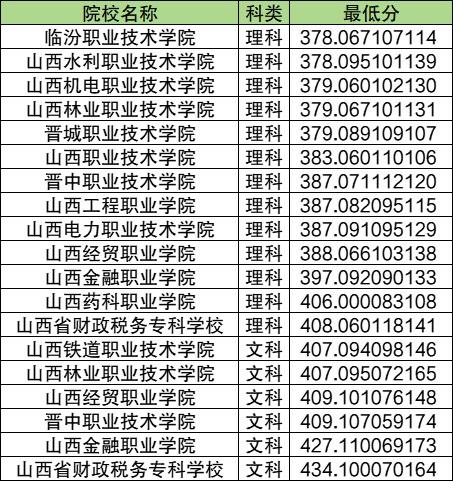 在理科方面,报考难度最大的是山西省财政税务专科学校,录取线是408.060118141分。理科上3+2专本贯通学校的最低分是378.067107114分,对应的院校是临汾职业技术学院。
