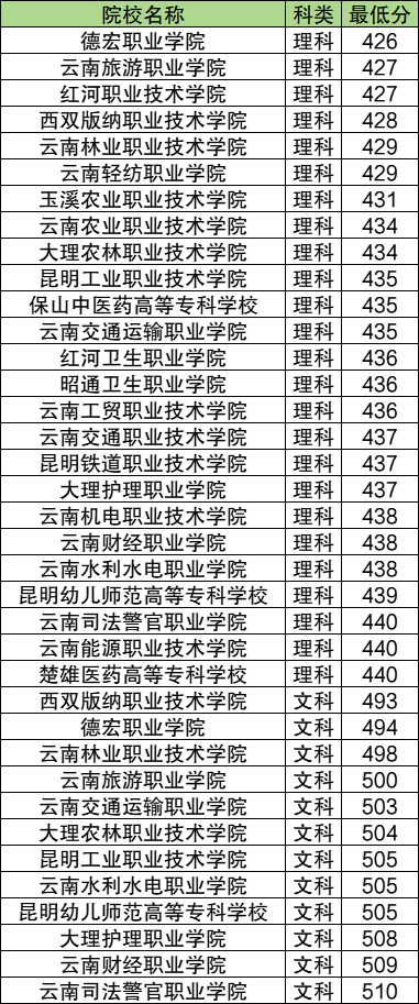 在理科方面,报考难度最大的是楚雄医药高等专科学校、云南能源职业技术学院和云南司法警官职业学院(440分),其次是昆明幼儿师范高等专科学校(439分),这两所是唯一分数在439分以上的院校。最好考的是德宏职业学院(426分),此外分数较低的还有云南旅游职业学院(427分)、红河职业技术学院(427分)。