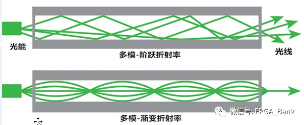 光纤按折射率分布来划分:多模光纤可分为阶跃型(突变型)、梯度型(渐变型、自聚焦型);
