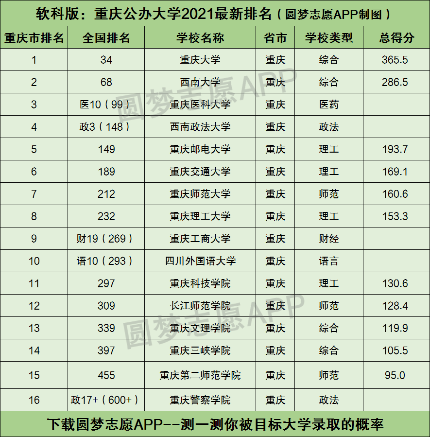根据软科2021年中国大学排名榜单,小编为大家整理出了重庆市内上榜的全部公办大学名单:包含这些大学在全国的排名、以及在重庆市内的排名。
