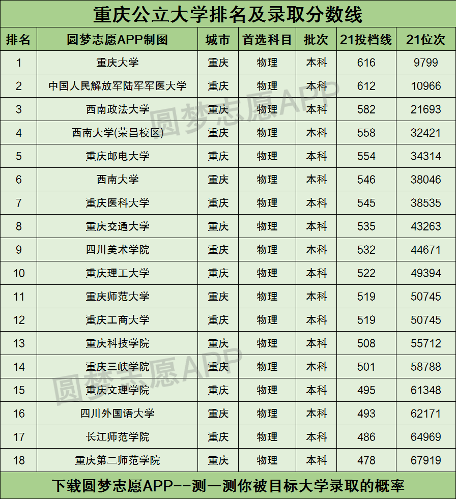 下图为重庆市所有公立本科大学的2021年物理类投档分数线排名(篇幅有限,仅展示了重庆物理类的录取数据。历史类的学生可以直接下载圆梦志愿APP查看数据)