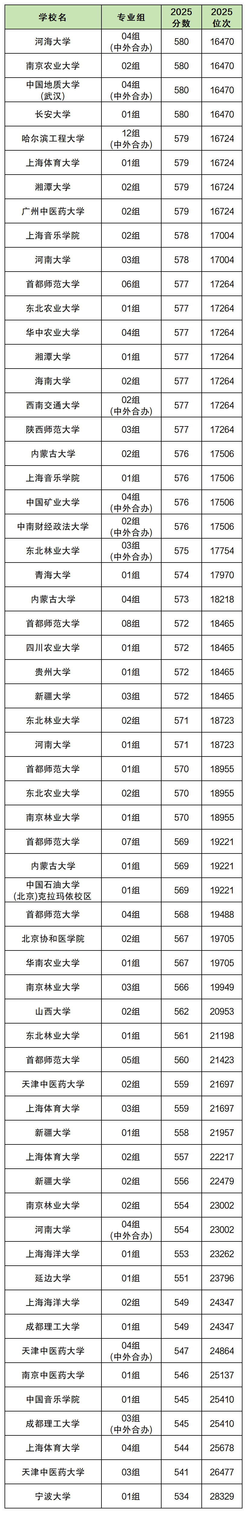 不是中外合作专业招生的有南京农业大学02组580分、湘潭大学01组577分、延边大学01组551分等。