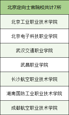 2024年在北京招定向士官的院校共有7所,包括北京电子科技职业学院、北京电子科技职业学院、成都航空职业技术学院、长沙航空职业技术学院等。