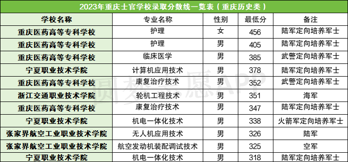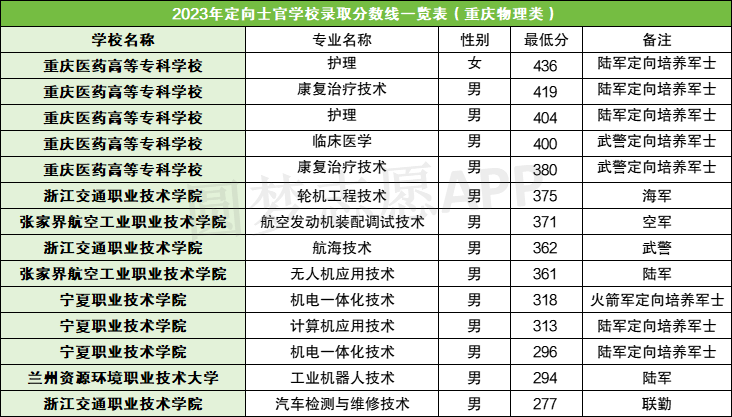 2024年定向士官面向重庆的招生中,在物理方面,男生的最低分为180,女生的最低分为424;在历史方面,男生的最低分为180,女生的最低分为427。关于各士官学校在重庆完整的分数线,详见下文。