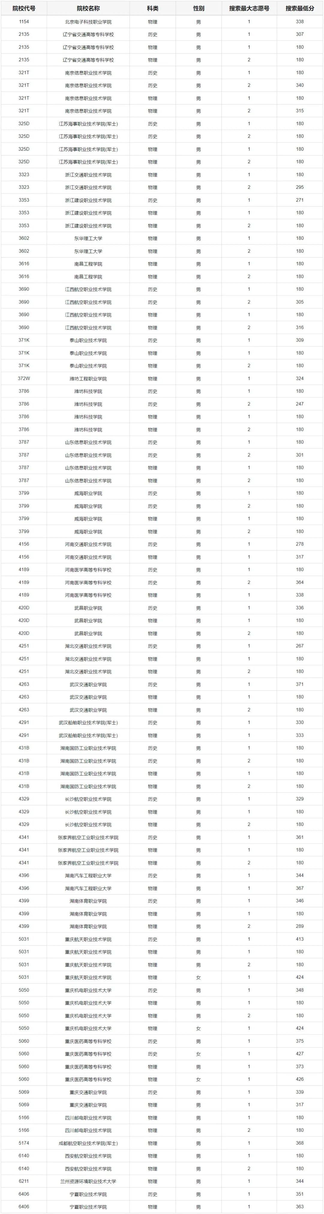 在物理类的最低分为:男生180,在历史类的最低分为:男生361。