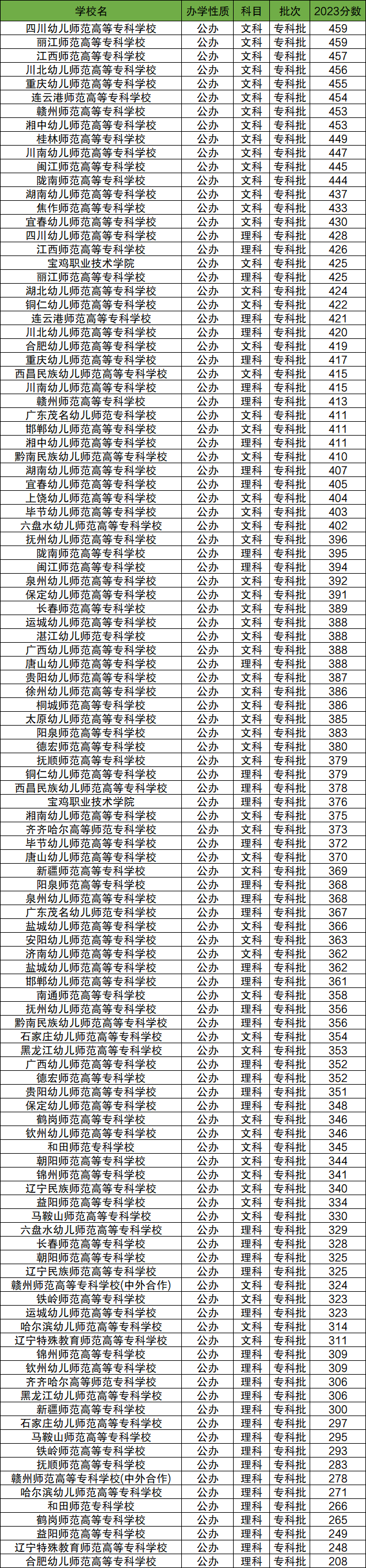 由于师范学校在各省的专科录取分数线都是有所不同的,在此以四川省为例,2023年在四川省分数线最高的师范大专学校是四川幼儿师范高等专科学校文科459分,理科428分。