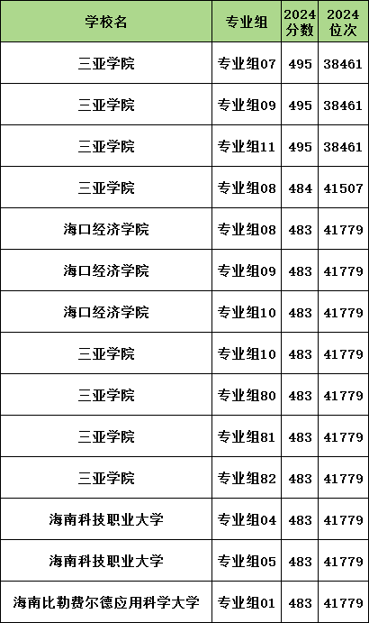 2024年海南民办二本最低录取分数线是483分,分数线最低的学校(专业组)是海口经济学院10组、三亚学院10组、海南科技职业大学04组等4所院校。