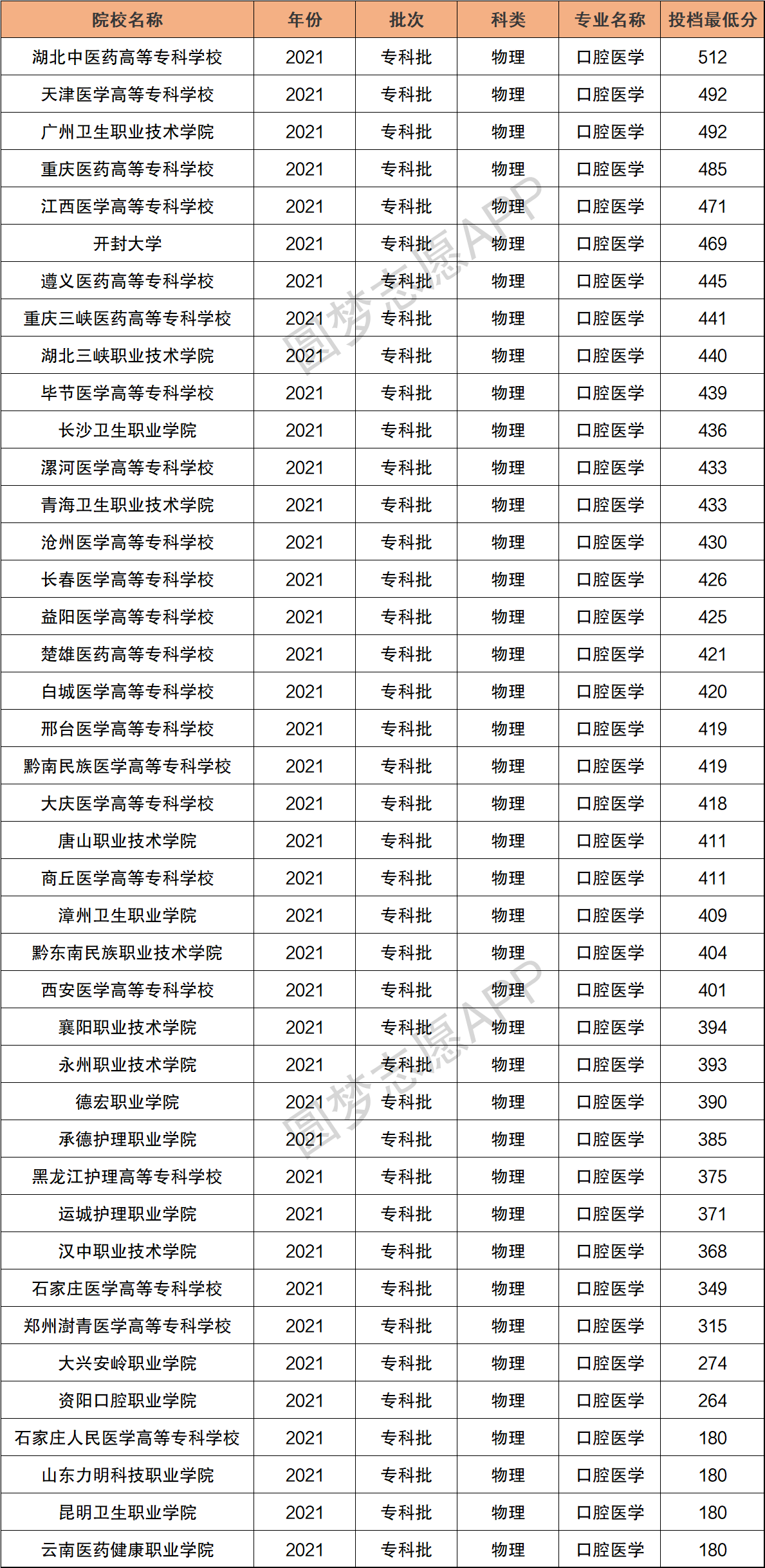 小编整理了2021年高职院校口腔医学专业在重庆市物理类的最低投档线,如下图: