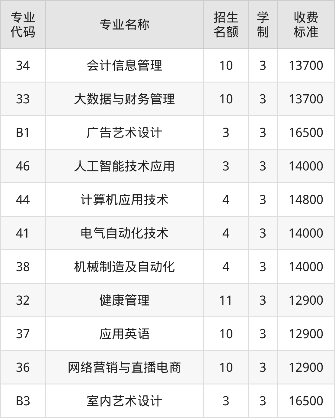 | 专业 代码 | 专业名称 | 招生 名额 | 学 制 | 收费 标准 |