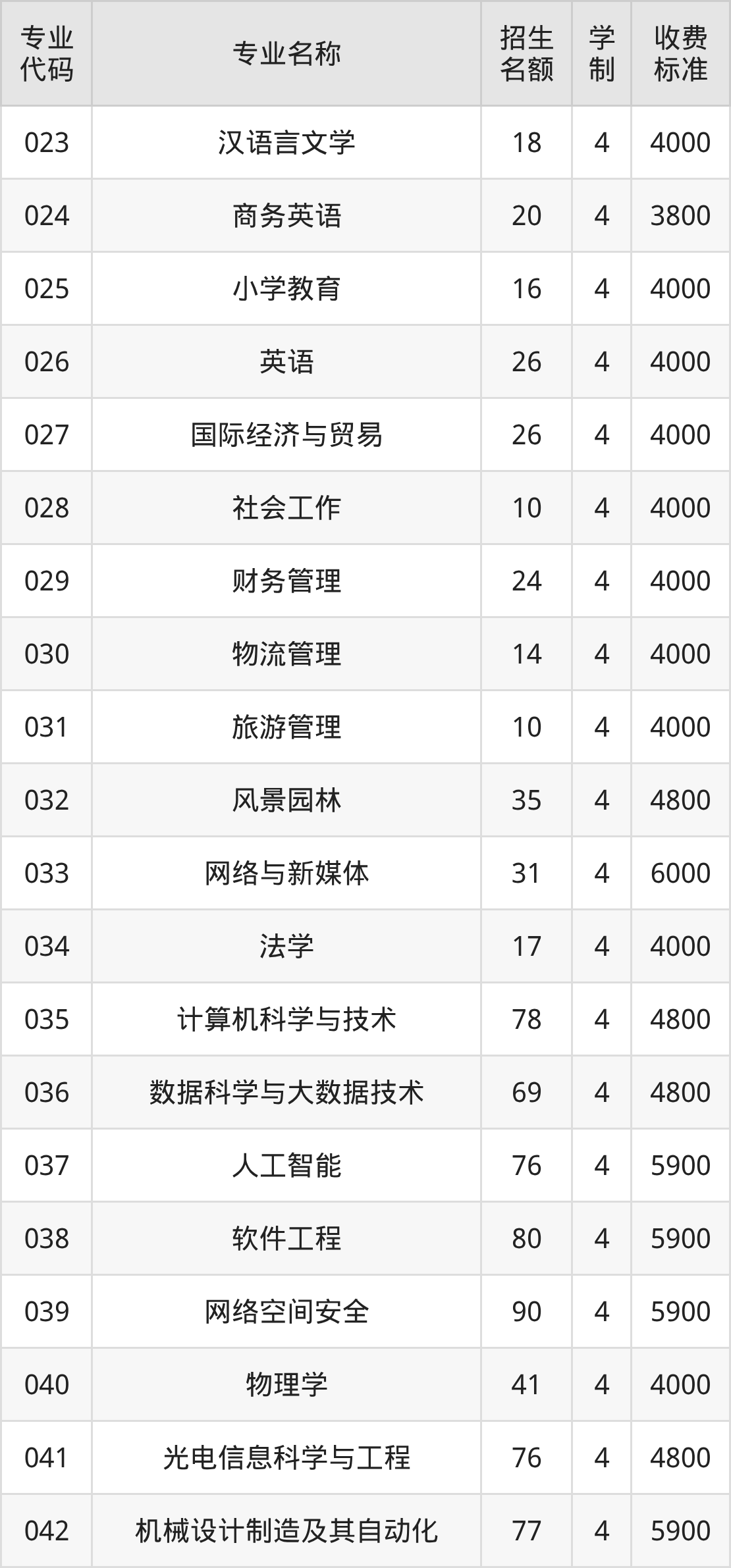 | 008 | 汉语言文学 | 65 | 4 | 4000 |