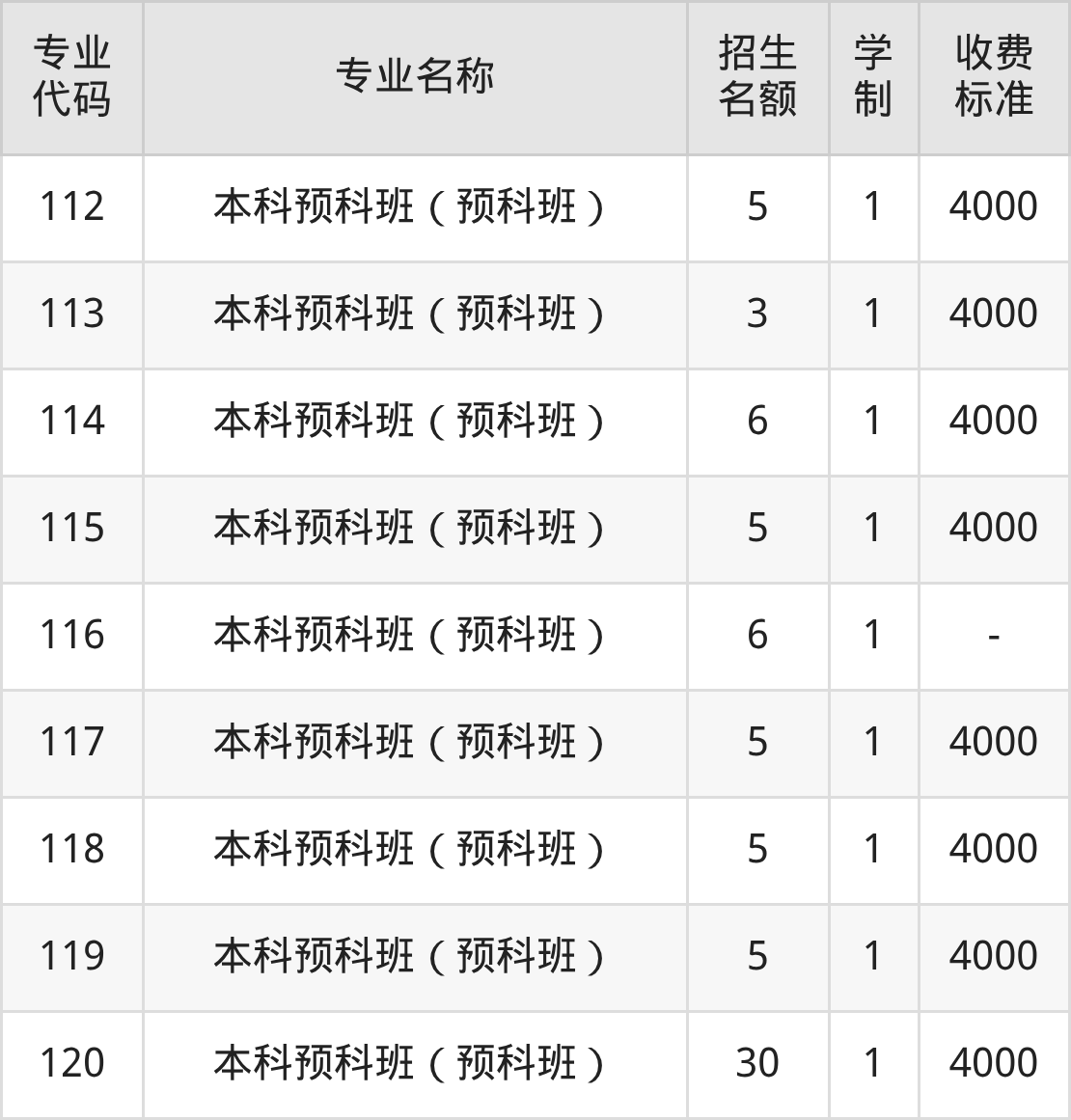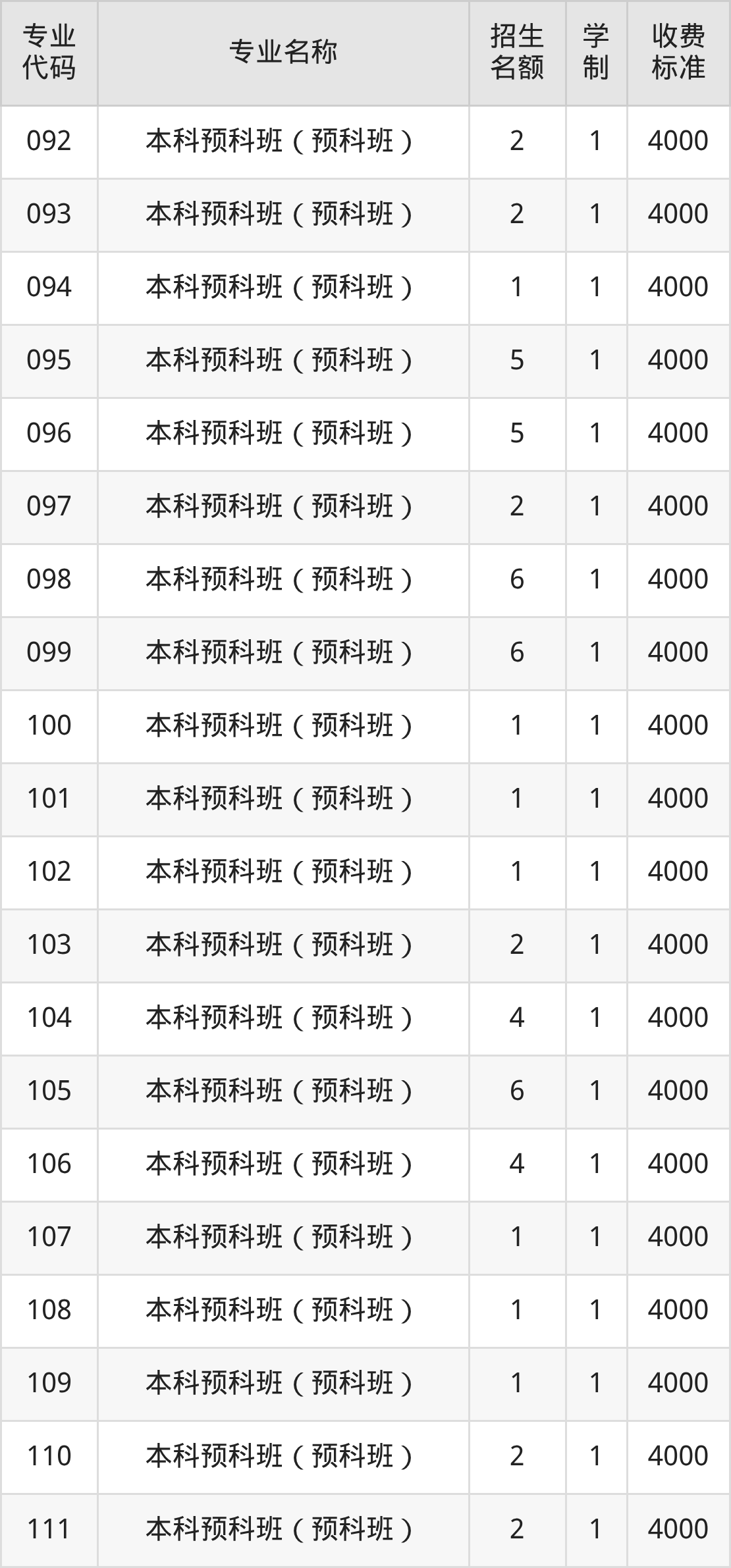 | 080 | 本科预科班(预科班) | 4 | 1 | 4000 |