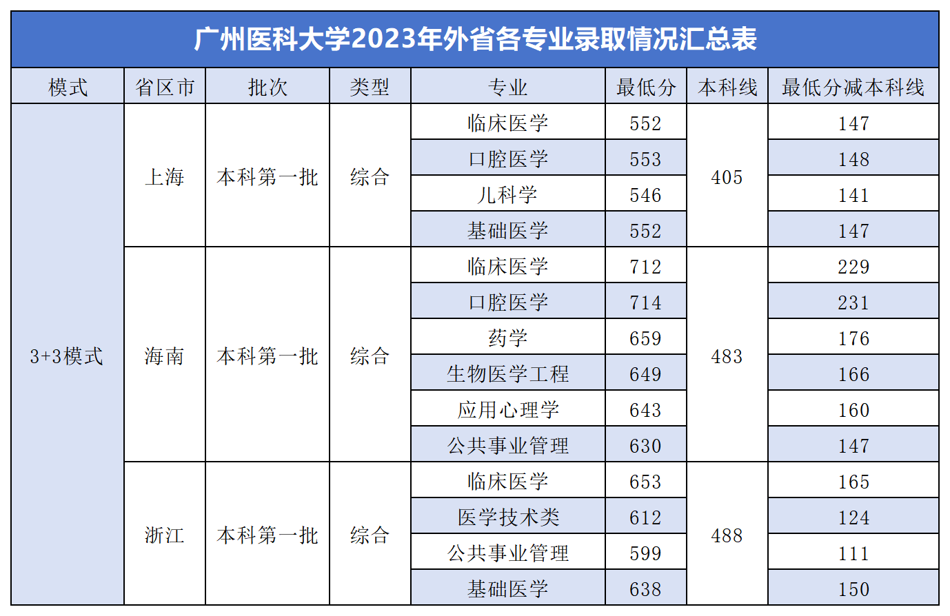 广州医科大学在省外录取分数线中,在“3+3”模式省份中,分数最低的是上海552分、对应基础医学专业。