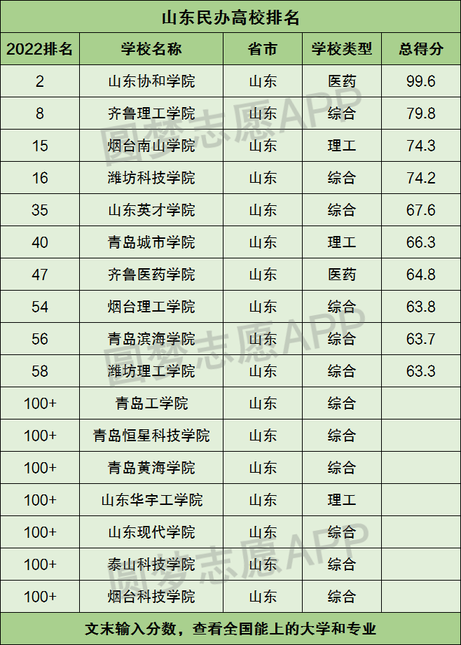 山东民办大学有山东协和学院、齐鲁理工学院、烟台南山学院、潍坊科技学院、山东英才学院等。根据软科2022民办高校排名,小编为大家整理出了山东省民办本科大学在全国高校中的排名。具体见下图: