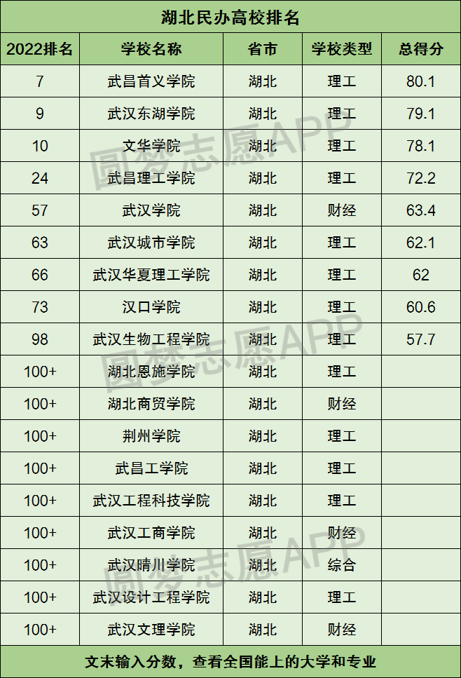 湖北民办大学有武昌首义学院、武汉东湖学院、文华学院、武昌理工学院、武汉学院等。根据软科2022民办高校排名,小编为大家整理出了湖北省民办本科大学在全国高校中的排名。具体见下图:
