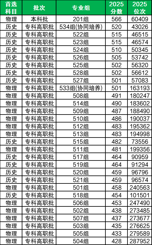 2025年深圳信息职业技术大学在广东省内招本科生、专科生,本科最低分为566分、最低分专业组为201组(物理类),专科最低分为428分、最低分专业组为504组(物理类)。结合批次线来看,考生成绩超本科线130分可上新大学本科、超专科线228分可上新大学专科。