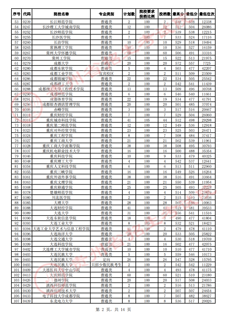 成都大学468分、成都医学院472分、重庆理工大学467分、大理学院473分、广东海洋大学452分、电子科技大学成都学院415分、大连民族大学410分、贵州财经大学425分、广西科技大学437分、贵州民族大学415分、贵阳学院397分。