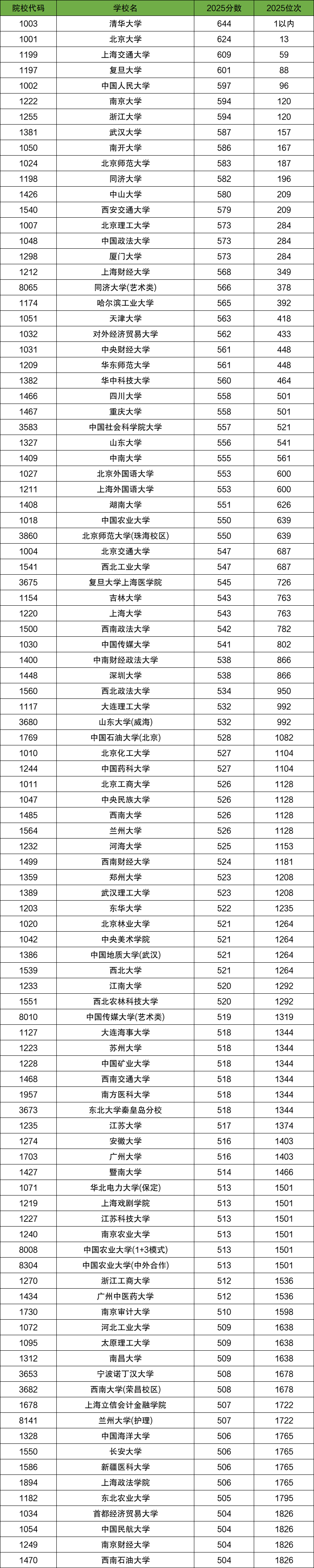 文科分数线最高、最难考的是清华大学(代号1003),2025年最低分644,最低位次1名以内。其次是北京大学(代号1001),2025年最低分624,对应最低位次13名。(本文篇幅有限,仅列举分数前100)