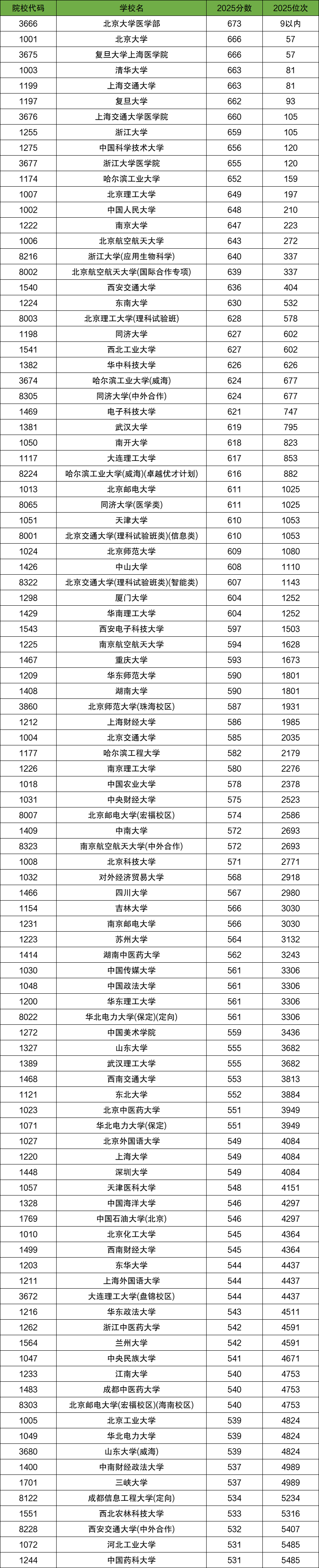 理科分数线最高的是北京大学医学部(代号3666),2025年最低分673,最低位次9名以内。其次是北京大学(代号1001),2025年最低分666,对应最低位次57名。(本文篇幅有限,仅列举分数前100)