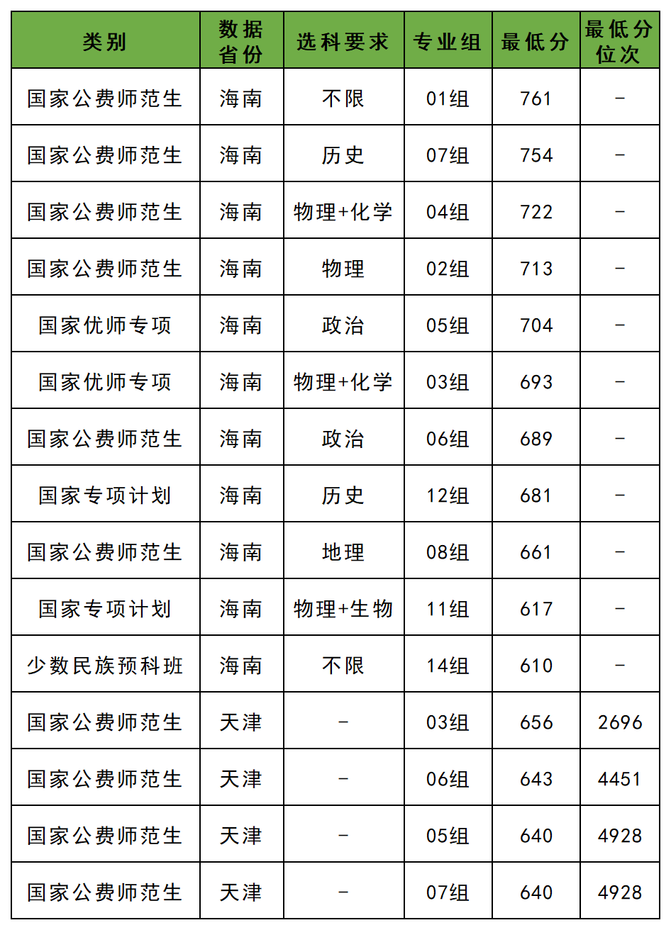 再比如在湖南,陕西师范大学录取最低分是601分,但这只是在物理类中国家优师专项的最低分,如果是物理类国家公费师范生的话,最低分则可达609分。另外历史类国家优师专项最低604分,国家公费师范生最低611分。