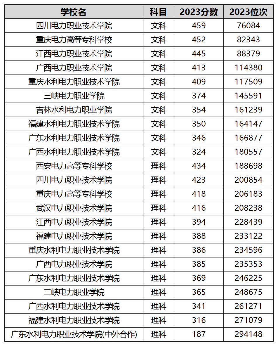 文科收分最低的电力专科学校是广西水利电力职业技术学院,2023年分数线为324分,面向文科生的招生专业是计算机应用技术、大数据与会计。最难考的电力专科学校是四川电力职业技术学院,2023年分数线为459分,面向文科招生专业是发电厂及电力系统、供用电技术、工程造价。