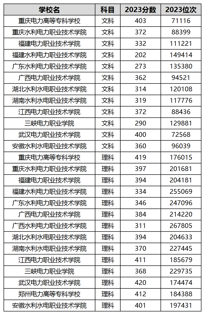 文科收分较低的几所电力专科学校是福建水利电力职业技术学院、广东水利电力职业技术学院、三峡电力职业学院,这三所学校在两百多分就可以报考,而重庆电力高等专科学校和武汉电力职业技术学院是最难考的,需要成绩在400分以上的同学。