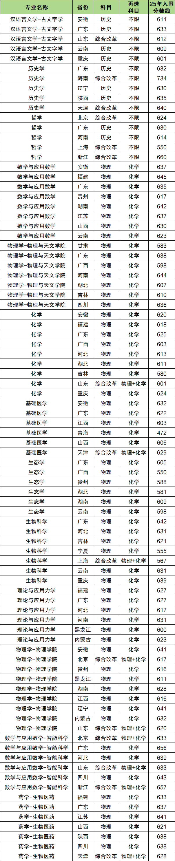 汉语言文学620分、历史学628分、哲学620分、数学与应用数学656分、物理学654分、化学625分、生态学641分、基础医学639分、理论与应用力学618分。