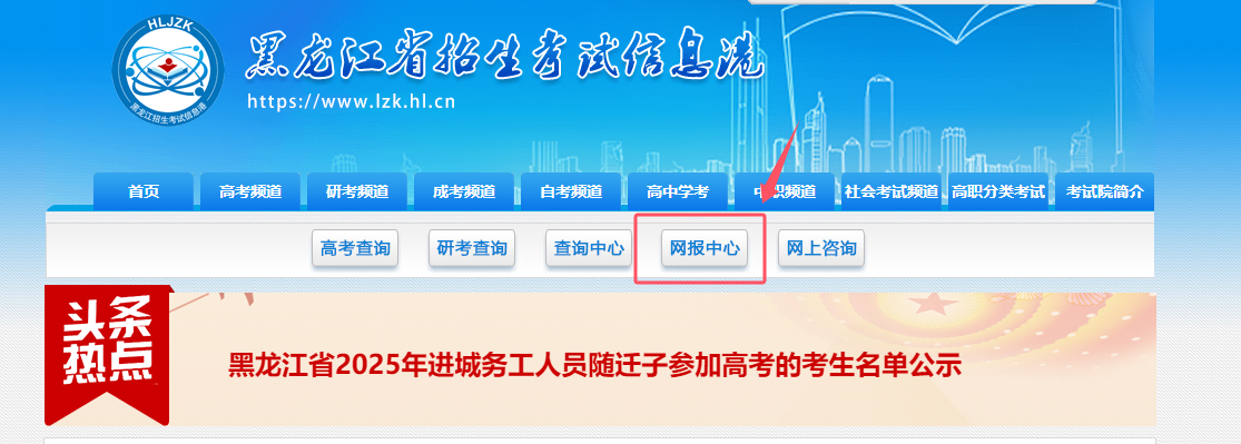 1、登录【黑龙江省招生考试院】或【黑龙江省招生考试信息港】网站点击【网报中心】,选择【2025年黑龙江省高考网上填报志愿入口】。
