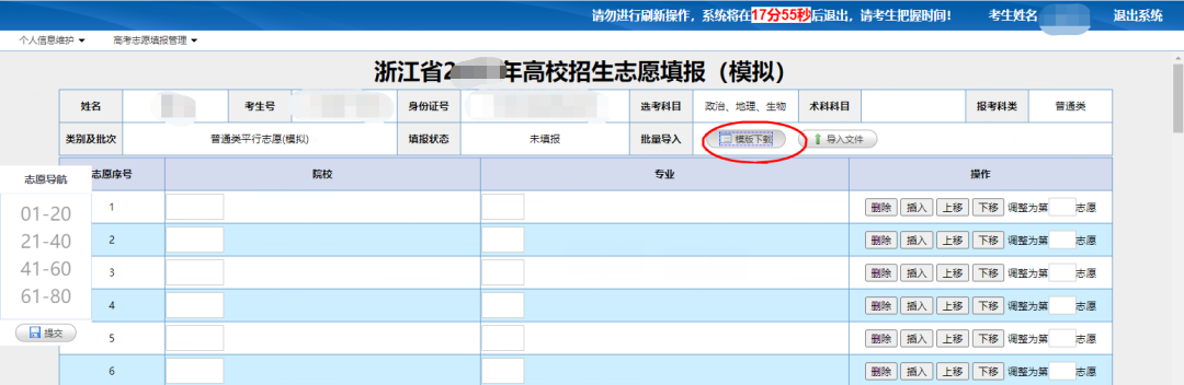以此类推,输入2,3,4-80输好之后点击右侧,自动生成志愿文档,保存到电脑相应位置,就产生志愿导入模板。