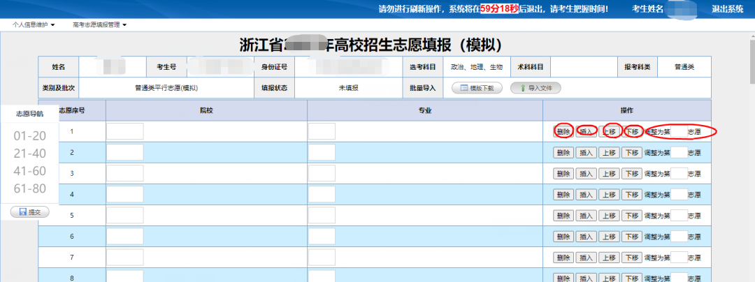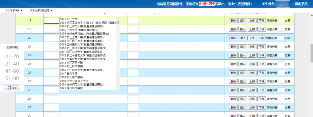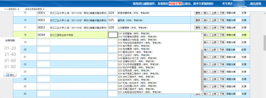 如果想对志愿进行修改,可以点击“删除”“插入”“上移”“下移”等进行调整,甚至可以直接“调整为第X志愿”一次性移到哪个位置。